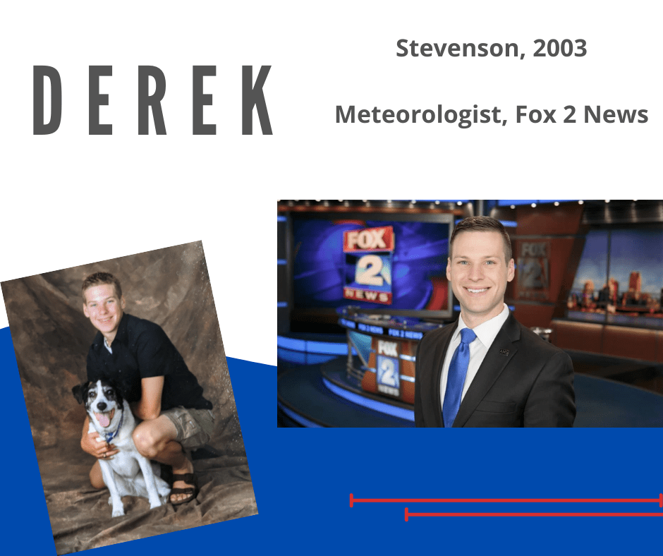 Derek attended Coolidge Elementary, Riley Middle School and Stevenson High School. You can catch him on the local news because he works as a Meteorologist at Fox 2 News.
