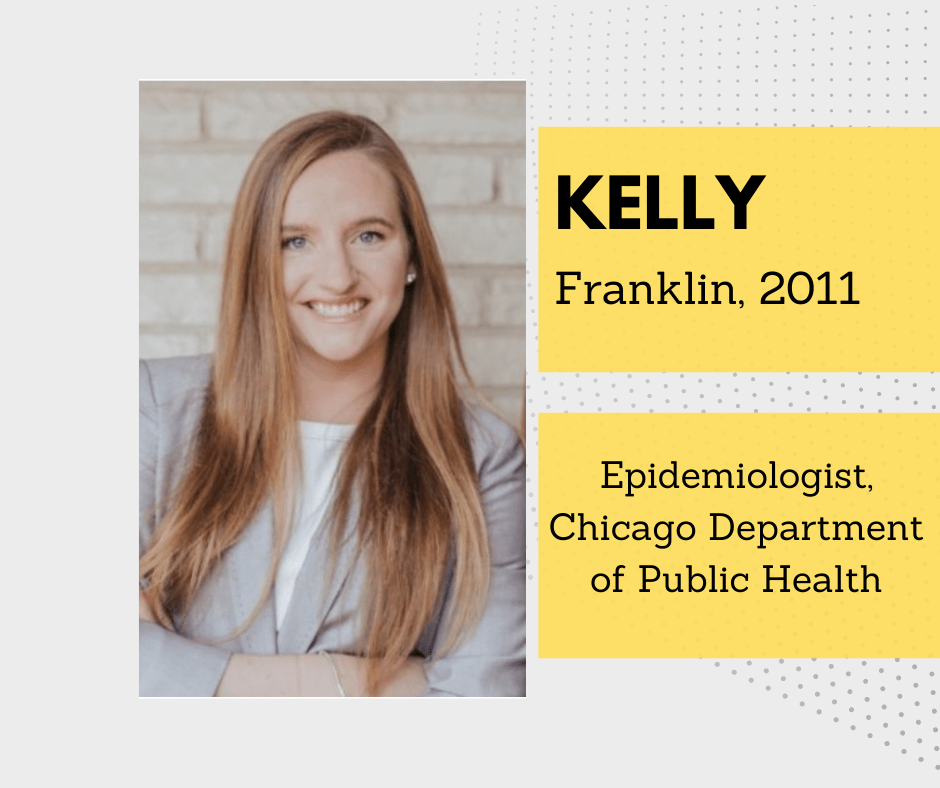 Kelly is an Epidemiologist at the Chicago Department of Public Health. Her role during the pandemic focused primarily on tracking COVID-19 cases and responding to outbreaks in healthcare settings, specifically nursing homes throughout Chicago.
