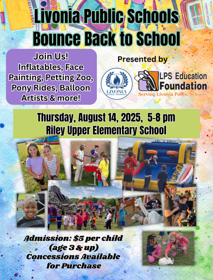 The annual event was held at Riley Upper Elementary School on Wednesday, August 24. Families enjoyed an evening filled with inflatables, pony rides, a petting farm, face painting, balloon twisters, food and more! A big Thank You to our sponsors: MacFarland Painting, Parkside Credit Union, MacFarland & Co. Home Sales, AlphaUSA, Livonia Chamber of Commerce, The UPS Store – 5 Mile & Newburgh, Larry’s Foodland and Allstate – Cheryl Bowker Agency. Thank you too all our volunteers including Foundations members, LPS employees, LPS high school students and the Stevenson High School hockey team!