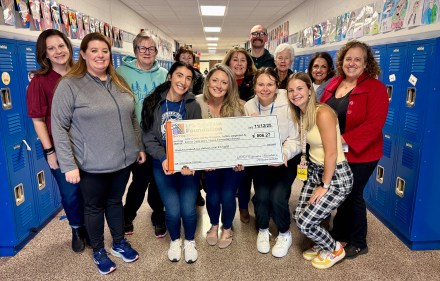 Allison Gray (not pictured), assistant principal at Riley Upper Elementary School, used the grant to create a Riley Reading Garden with hammocks. Pictured receiving the grant is Principal Kristyn Cousino.